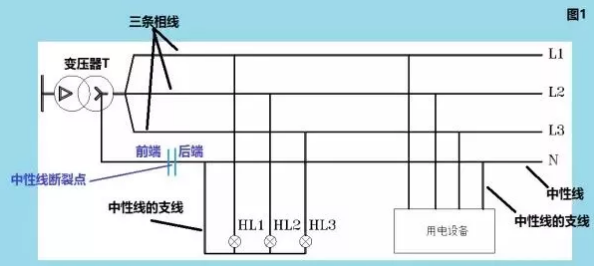我们再来看图1。图1中的中性线发生了断裂,于是在断裂点的前方,中性线的电压依旧为零,但断裂点的后方若三相平衡时,它的电压为零;但若三相不平衡,则断裂点后方的中性线电压会上升,最高会升到相电压。