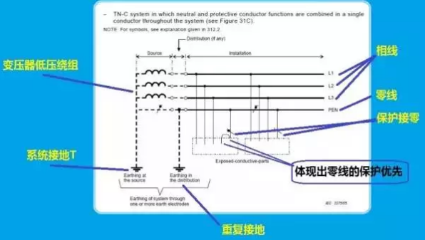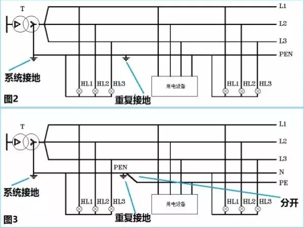 注意哦,图2对应的接地系统叫做TN-C,而图3对应的接地系统叫做TN-C-S。