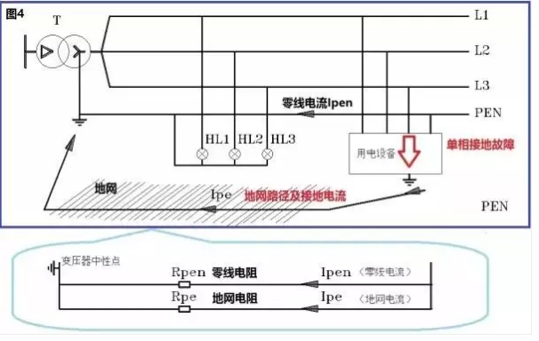 我们看图4的下图,我们发现当L3相对用电设备的外壳短路时,保护性中性线中有电流流过,地网中也有电流流过。