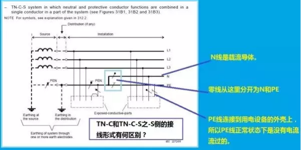 TN-C-S区别于TN-C,就在于PEN在重复接地后分开为N中性线和PE保护线。