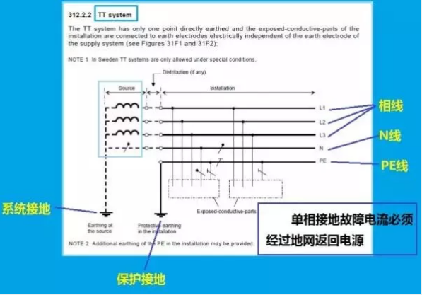 由于TT下通过地网的接地电流很小,所以IEC和国家标准都规定了必须安装漏电保护装置RCD。