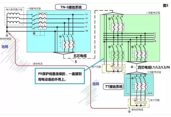 图4中,变压器中性点接地,而用电设备的外壳直接接地。