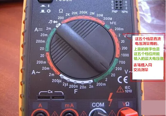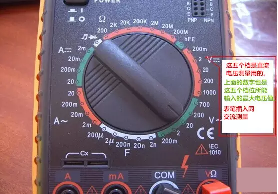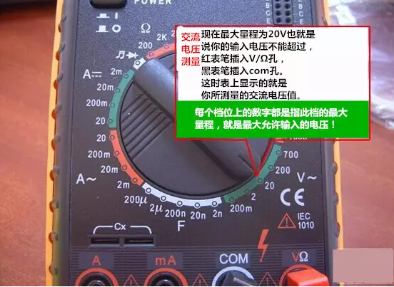 2、功能旋转开关打至V~(交流),V-(直流),并选择合适的量程 。