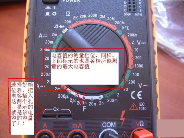 2、将功能旋转开关打至电容(C)测量档,并选择合适的量程。